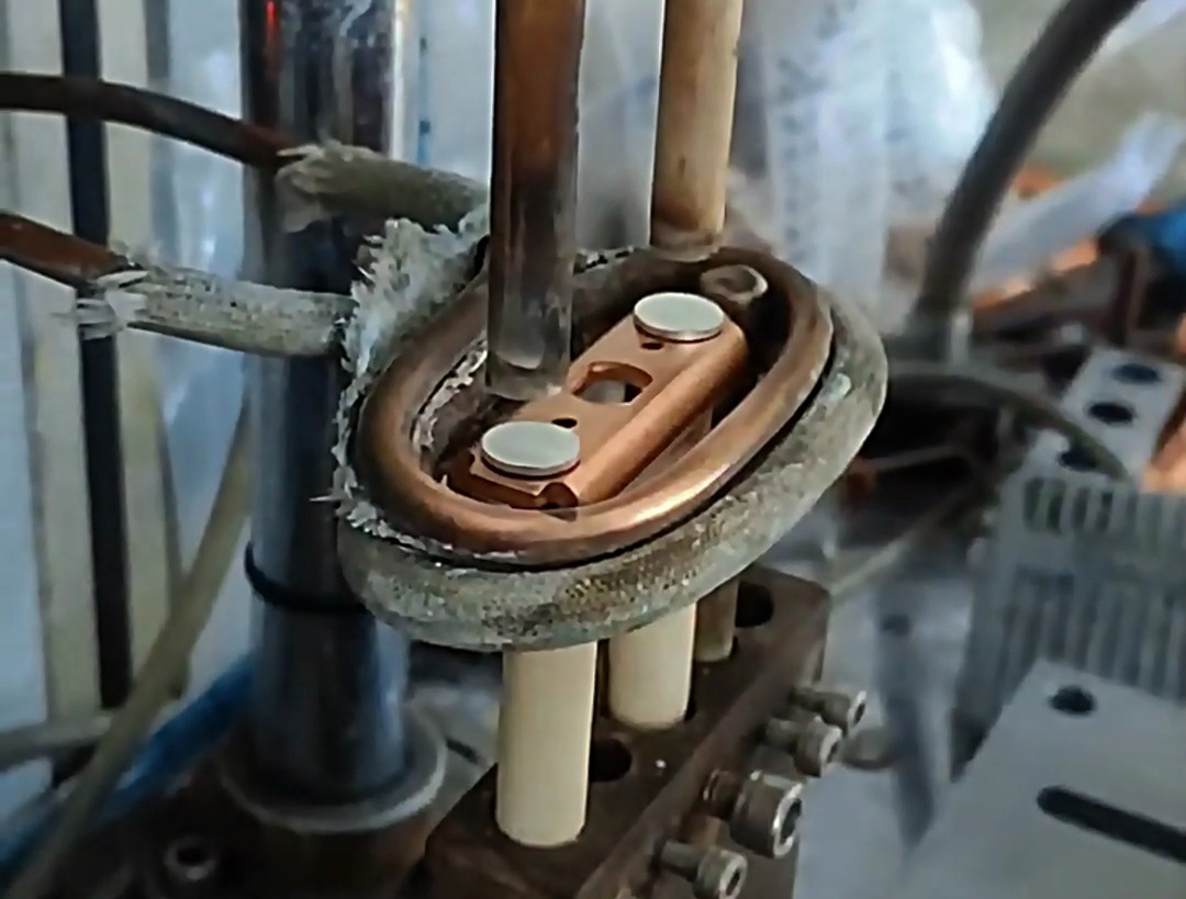 啟動高頻焊機,感應線圈對準焊接區域,幾秒內接頭快速均勻升溫。兩種材料同步受熱,焊料迅速熔化并充分浸潤焊縫。