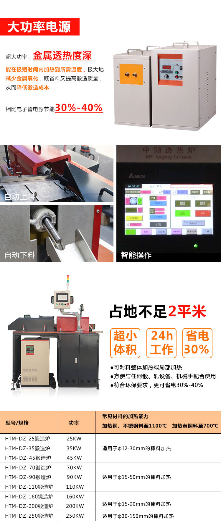 别名Q中频锻造加热炉 型号QHTM-DZ 电压Q?80V 功率Q?5-250kw 用途:新型节能中频感应加热透热锻造炉铜棒淬火退火透热U冲L讑֤,适用于铜、铁、铝材的透热Q圆料、方形料或其它Ş状毛坏料{的q箋透热Q可Ҏ整体加热或局部加?/br>